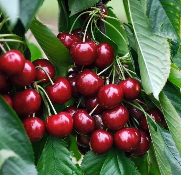 Frucht: Sehr groĂe Frucht, dunkelrot mit hellen Sprenkeln. Relativ weiches Fruchtfleisch, sehr hoher Saftgehalt, sĂźĂ. Reifezeit mittelfrĂźh, 5. Kirschenwoche.
